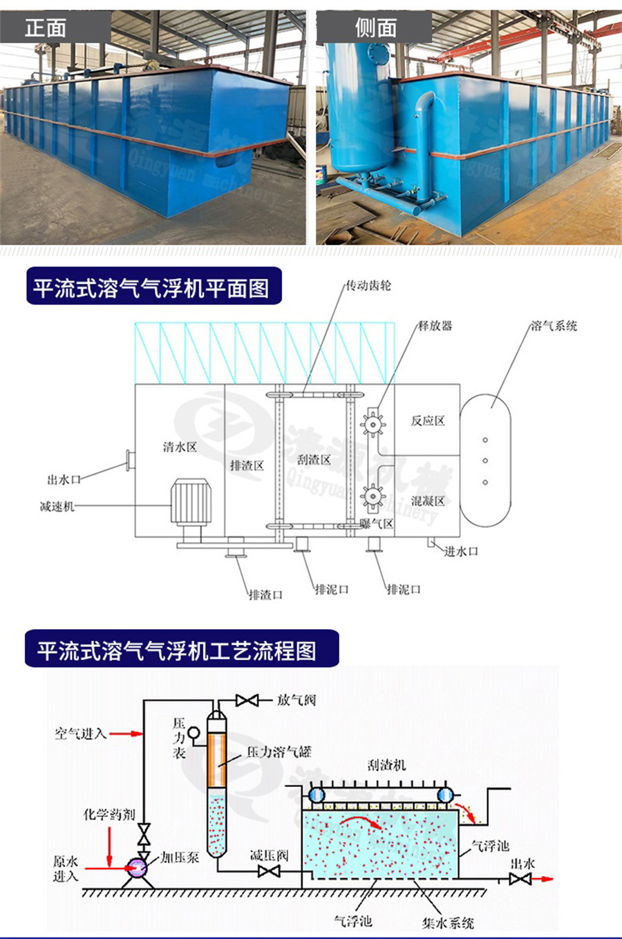 结构特点:设备主体为长方形钢制结构。主要部件由溶气泵、空压机、溶气罐、长方形箱体、气浮系统、刮泥系统等组成。