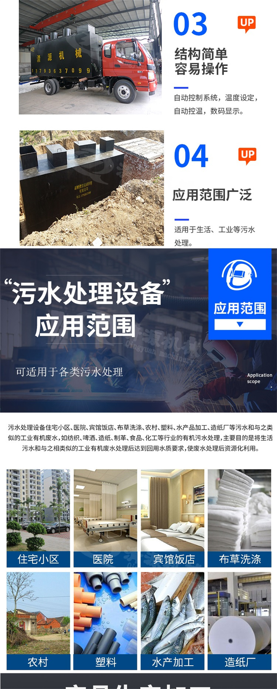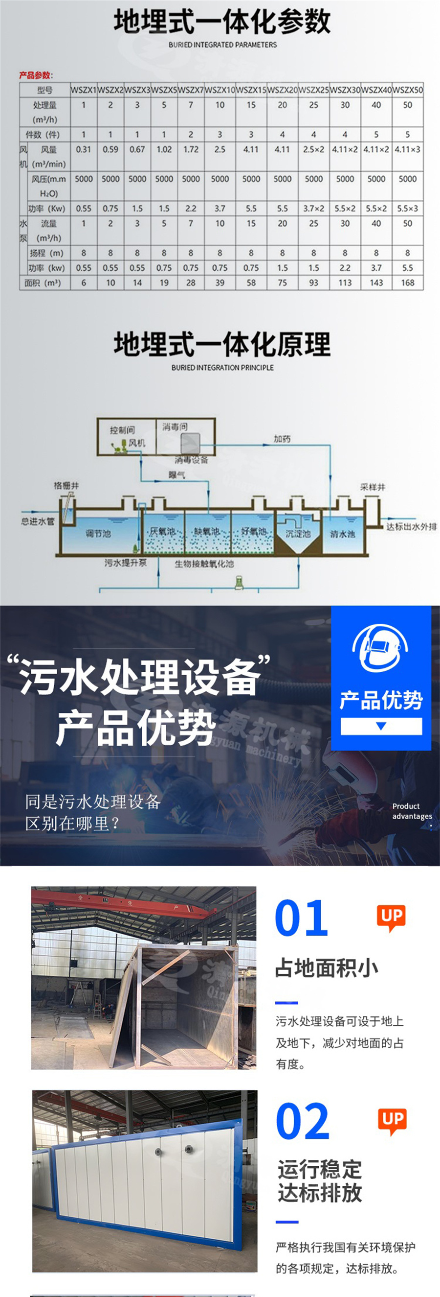 经过农村污水处理设备处理的出水水质,能够达到国内排放标准。全套设备均可埋设于地下。农村污水处理设备适用于住宅区,饭店,宾馆,疗养院,矿山,工厂,屠宰厂等生活污水处理及类似的工业污水处理。在总结国内外生活污水处理装置的运行经验基础上,再结合科技成果和工程实践,设计出一种可地埋设置的成套有机废水处理装置,即以碳钢防腐为主要原料的WSZ型系列污水处理设备。其目的主要是使生活污水和与之类似的工业有机废水经该设备处理后达到用户要求的排放标准。该设备主要用于居住小区(含别墅小区),宾馆,医院,屠宰厂,综合办公楼和各类公共建筑的。特点:可埋入地表下,不占用地表面积,节省空间,设备上方地表可作为绿化或其他用地,不需要建房及采暖和保温,全自动控制,不需人员管理无污泥回流操作简单,维修方便。整个设备处理系统配有全自动电气控制系统,运行安全可靠,平时一般不需要专人管理,只需适时地对设备进行维护和保养。 噪音低,无异味,使用寿命长。