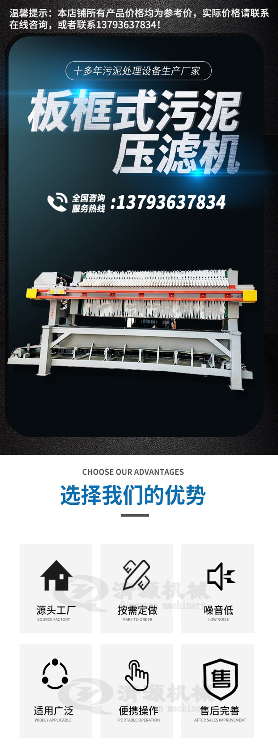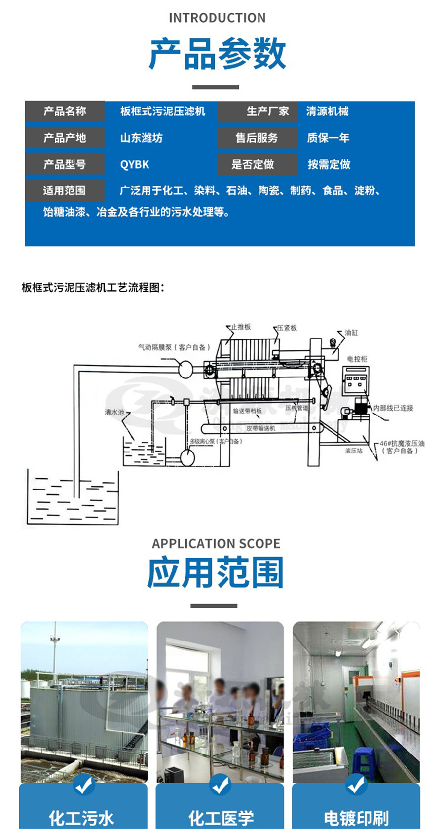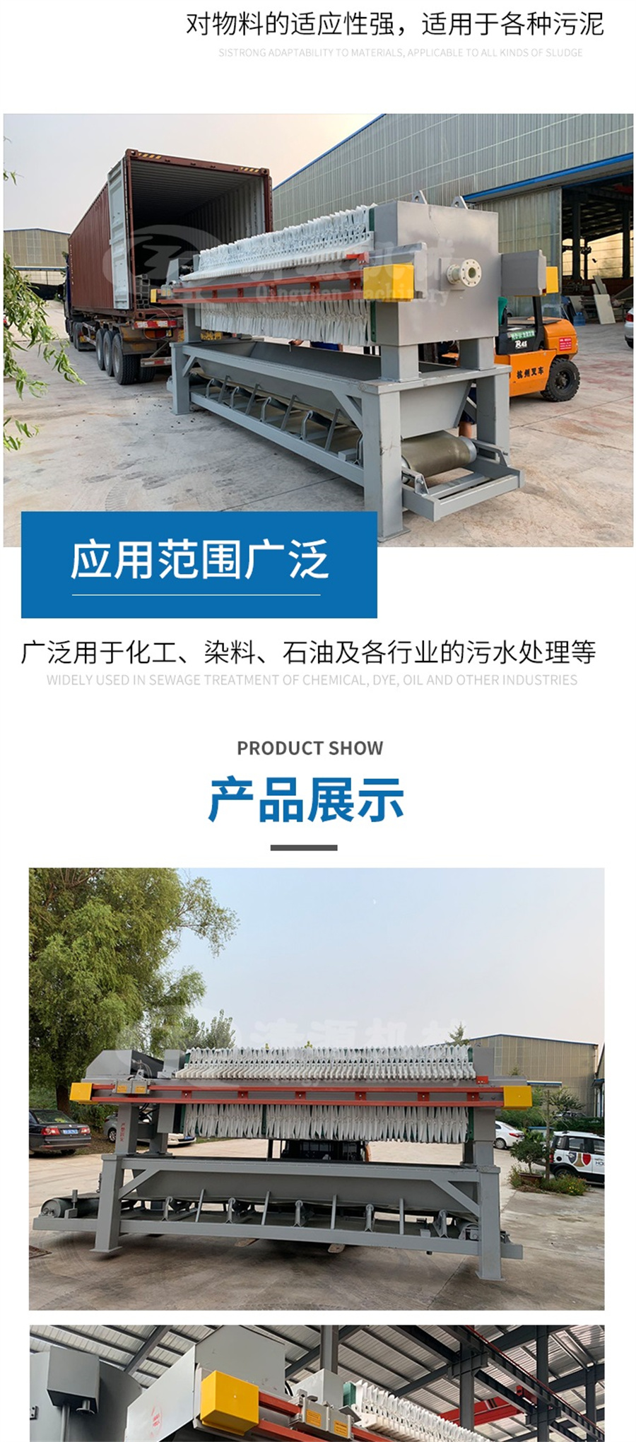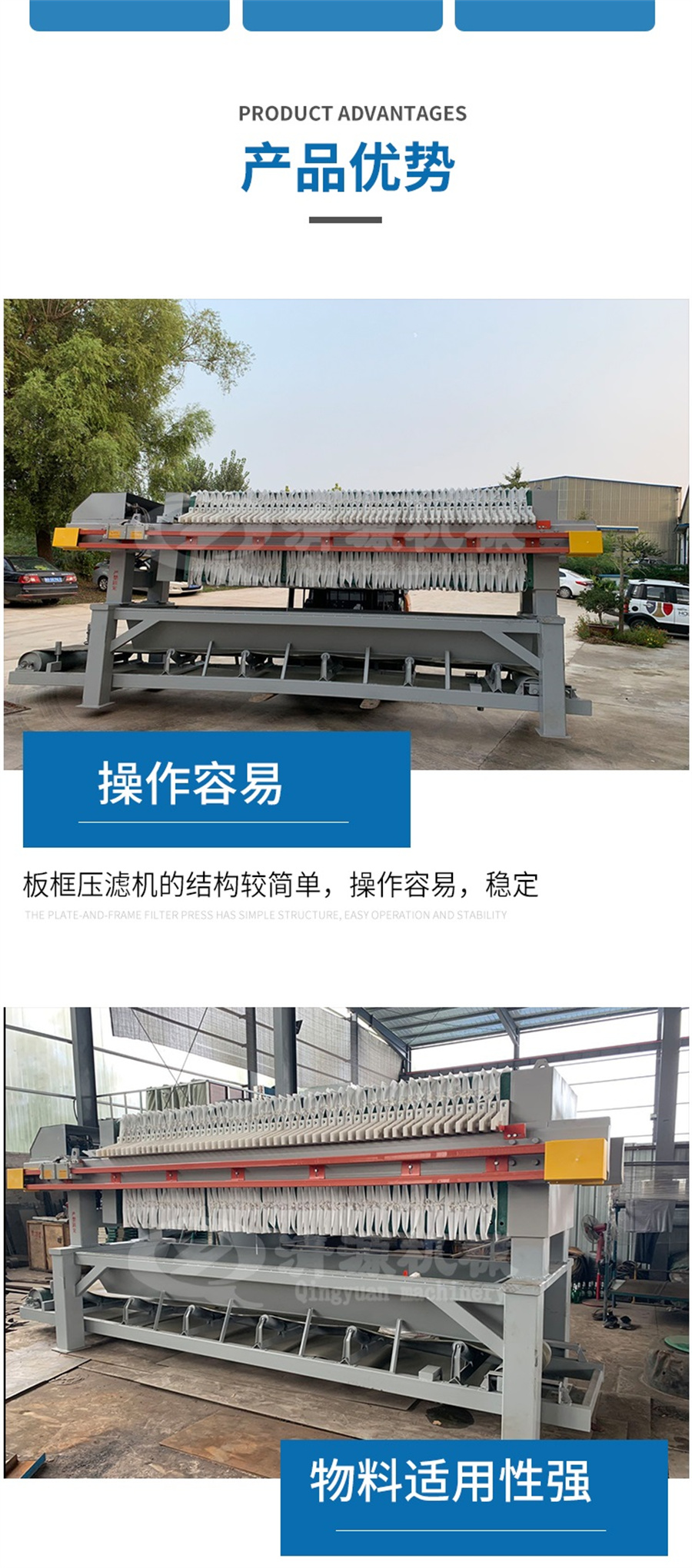 三、优点:板框式压滤机的优点是:结构较简单,操作容易,运行稳定,保养方便;过滤面积选择范围灵活,占地少;对物料适应性强,适用于各种中小型污泥脱水处理的场合。