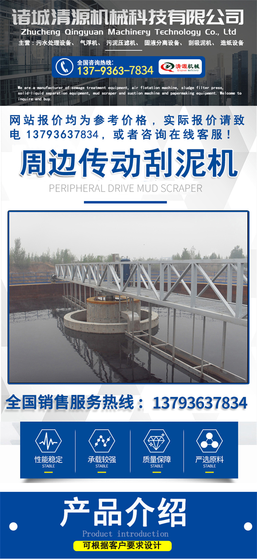 设备为中心支墩双(单)周边传动,其传动力矩大、节能。采用中心进水和排泥,周边排水,保证水流均匀,利用液位差自吸式排泥。
