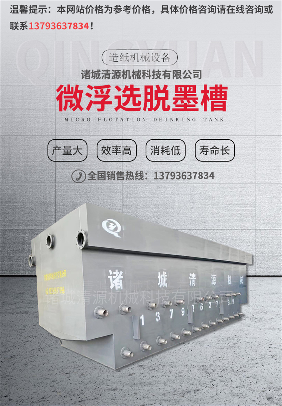 微浮选脱墨机具有浮选前后提高白度显著:4-9ISO,纤维流失≤0.5%,动力消耗为传统浮选的1/2或1/3。能够去除油墨颗粒的尺寸范围大,大约5-550微米。内置式曝气元件,有利于工艺气体回路封闭。浮选脱墨机槽体间组合合理,液位控制简单,运行可靠,产量范围大。