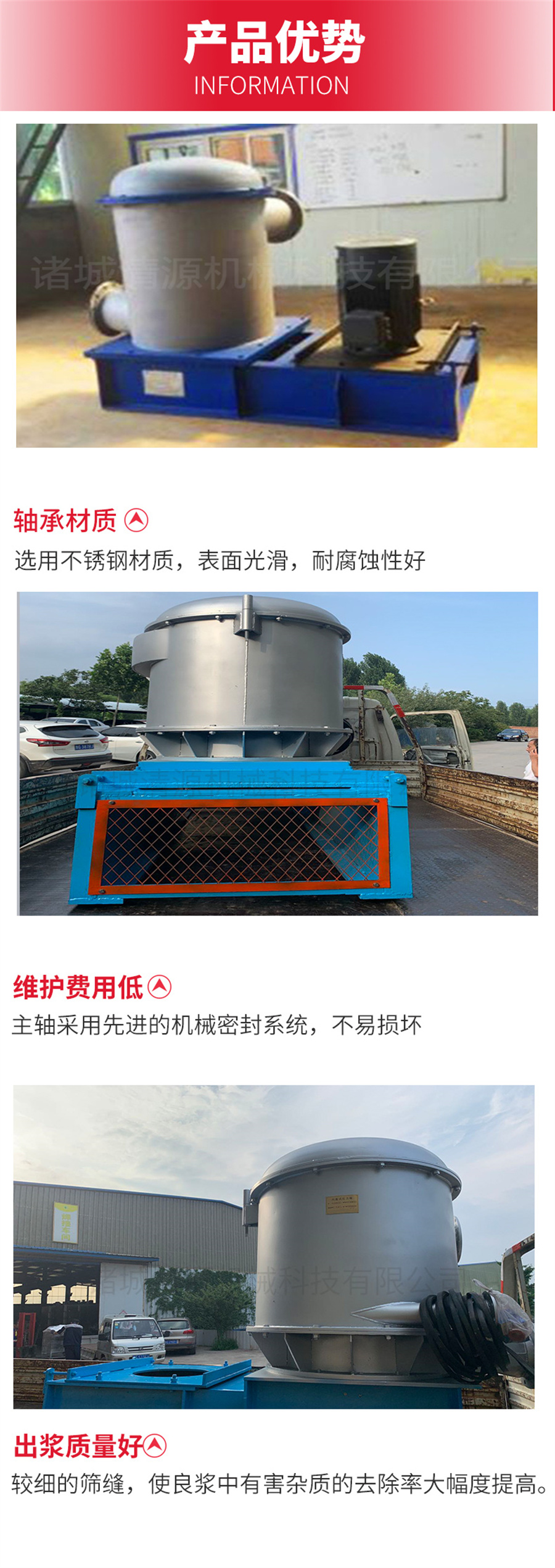 1、筛选效率高:由于浆料以较高的压力切线进入筛内,受离心力作用,浆料在进入筛鼓之前,纤维和粗杂质就已经进行了分离。合格的纤维依靠进浆口的压力差,通过筛鼓。同时高速旋转的翼片起着净化筛鼓表面缝隙的作用。故在相同的动力、相同的筛选面积的同等条件下,该筛比其它形式的筛选设备有较高的筛选效率和更好的出浆质量。