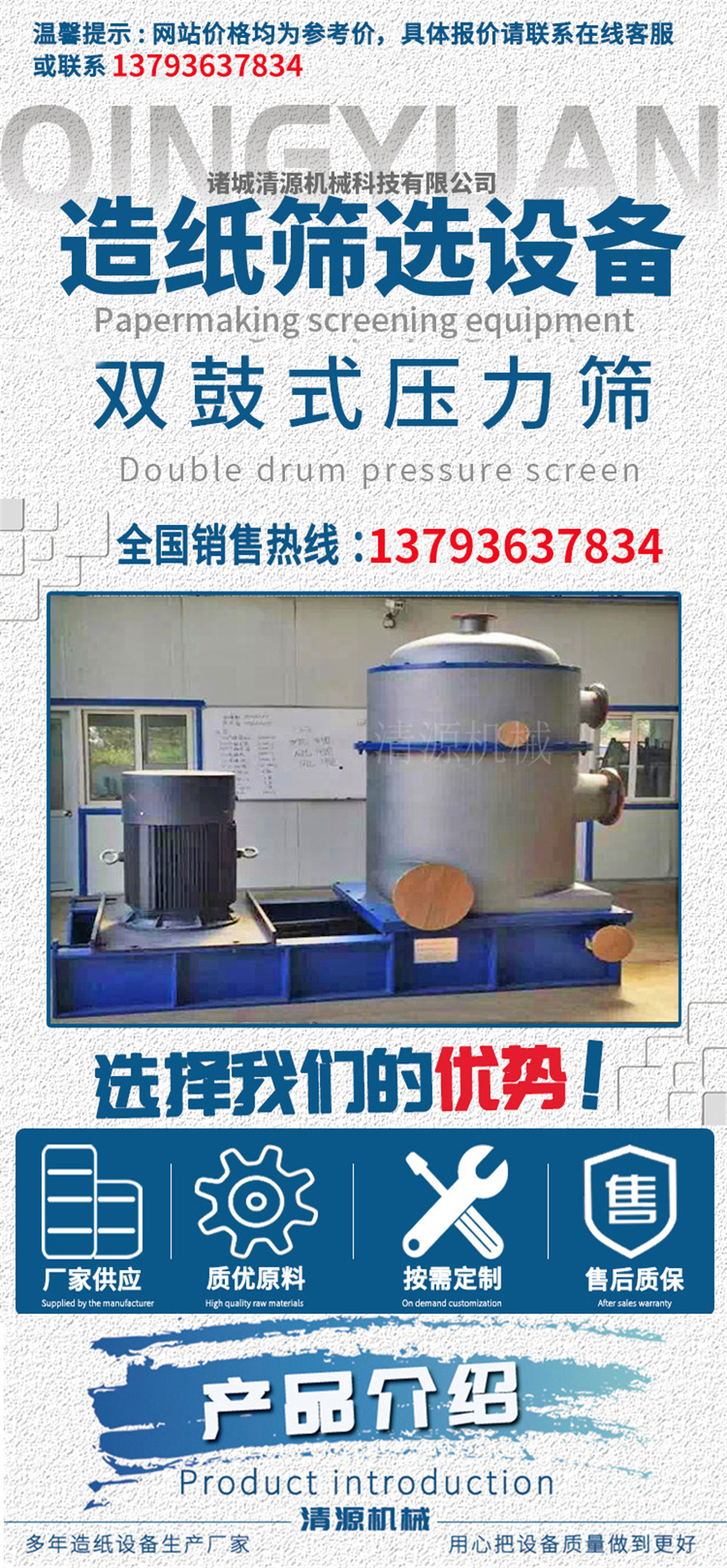 概述:诸城清源机械双鼓筛是引进国外新技术,经改进生产的一种低耗筛浆机。它以特殊的设计和高精度的制造加工,配备双鼓双旋翼,双曲线型的旋翼,保证 了纤维的无脉冲流体化运行,对分散纤维填料和造纸助剂筛选杂质起到把关的作用;能更大满足纸机流浆箱的所有运行要求,是现代纸机浆系统的选择设备。